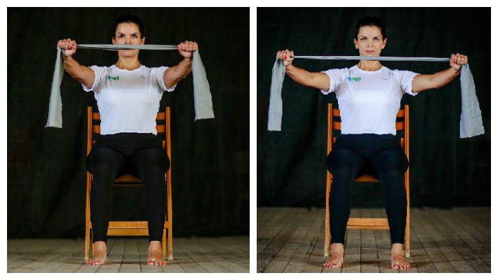 הנחיות: שבו במרכז הכיסא והעבירו את הגומייה מתחת למושב, אחזו את הגומייה משני צדיה והזדקפו. לאחר מכן, הרימו את הגומייה עד גובה הכתפיים תוך הקפדה על זרועות ישרות, מבלי להזיז את הגב ותחזירו אותה למטה באיטיות.