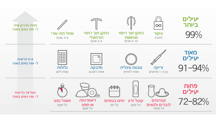 הכי יעילים: אמצעי מניעה ארוכי טווח הפיכים כמו התקן תוך רחמי ושתלים. מדובר על הריון אחד לכל 100 נשים בשימוש לשנה.