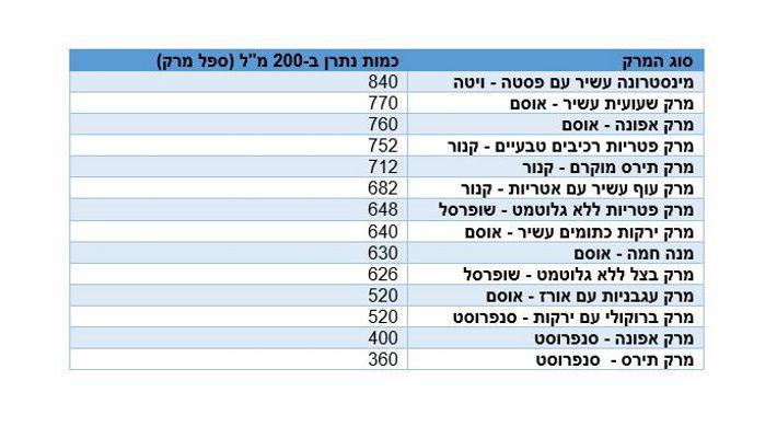 *הנתונים נלקחו מרשימת הרכיבים שכל יצרן חייב על פי חוק להדפיס על גבי האריזות