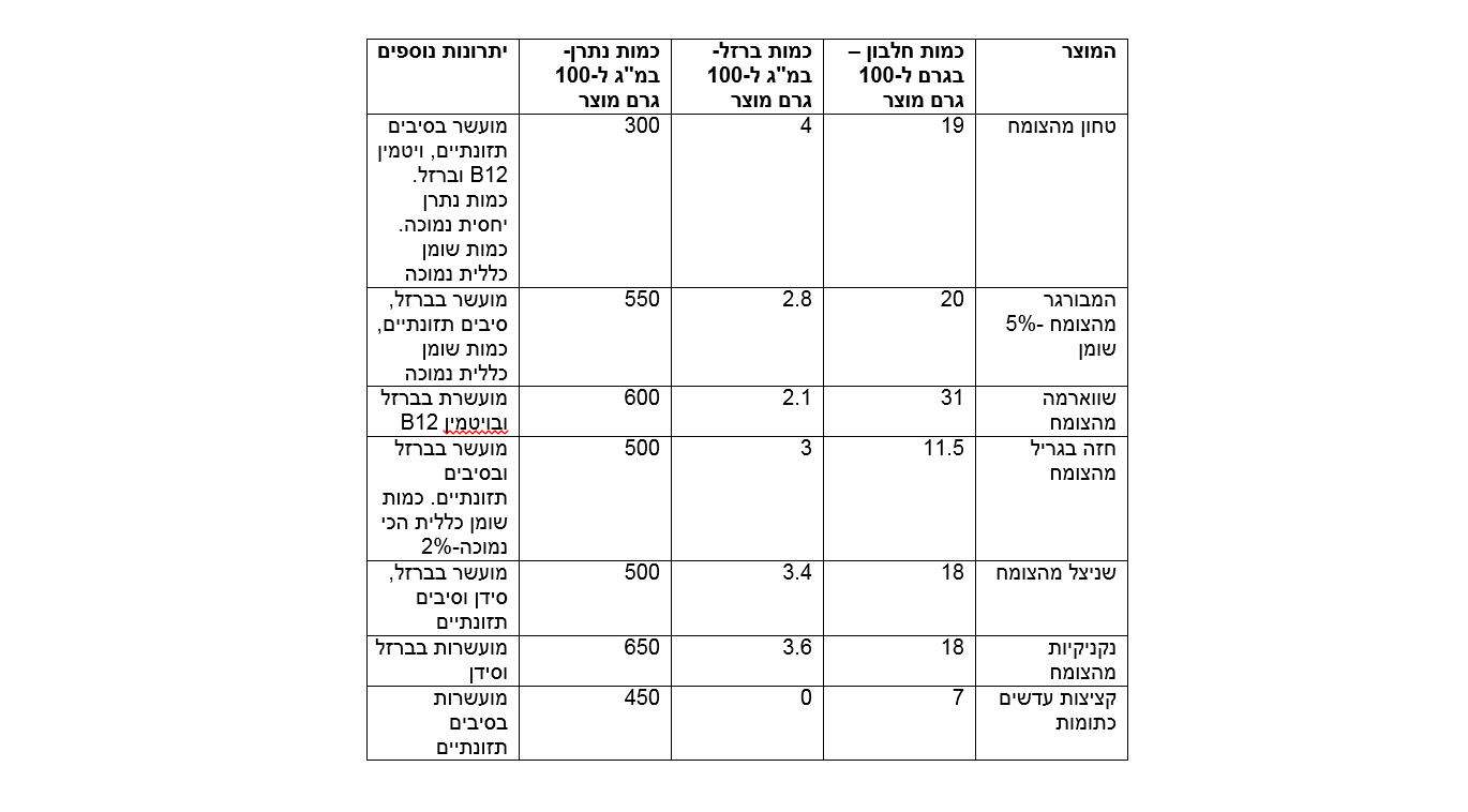 המוצר מועשר בסיבים תזונתיים, בויטמין B12 ומכיל כמות נתרן נמוכה באופן יחסי – כ-300 גרם למוצר.
