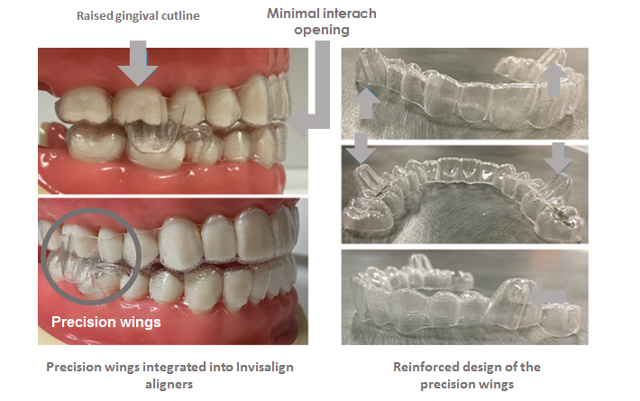 בעבר הקשתיות אפשרו רק את סידור שיניים ולא ניתן היה לתקן בעזרתן פער בין לסתי. כדי לתקן את הפער שבין הלסתות היה צורך להיעזר במכשירים, כמו רסן חיצוני. הכנפיים הצדדיות בקשתיות השקופות מאפשרות טיפול בפער בין הלסתות ללא כל צורך בשימוש במכשירים נוספים.3. הוספת אינדיקטור צבעוני